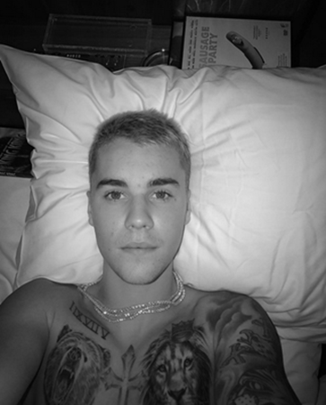 Justin Instagrammed a selfie today from his bed. The new ink is definitely stealing the show. He now has a large lion head on his left pec, directly below his crown tattoo (so the lion is now balancing the crown on its head).