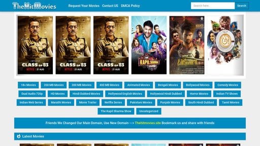 he categories found on the website include 18+ Movies, 200 MB Movies, 400 MB Movies, Animated Movies, Bengali Movies, Bollywood Movies. Comedy Movies, Dual Audio 720p, HD Movies, Hindi Dubbed Movies, Hollywood English Movies, Hollywood Hindi Dubbed, Horror movies. Indian TV shows, Indian Web Series, Marathi Movies, Movie Trailer, Netflix Series, Pakistani Movies, South Hindi Dubbed, Tamil movies, The Kapil Sharma Show, and Uncategorized. These are the list of categories that can be found on Thehitmovies website. Feel free to click on one as you navigate the website.